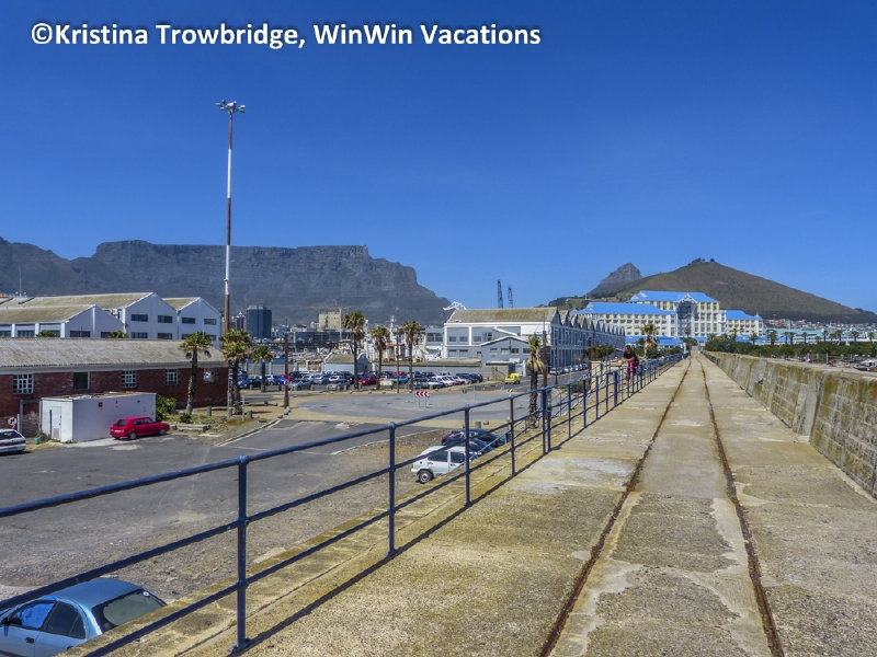 Cape Town harbour breakwater pier with Table Mountain and Devil's Peak