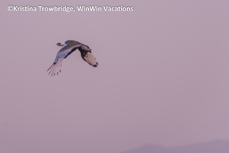 Black-bellied bustard taking off into the sunset