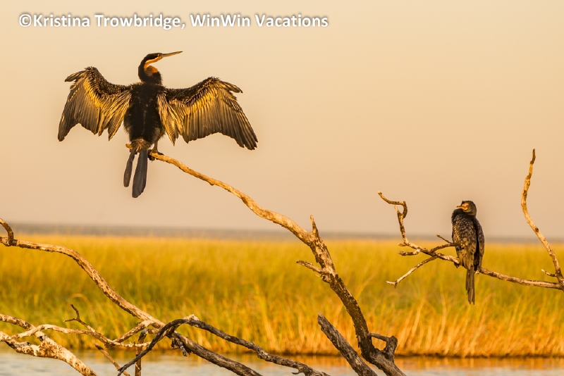 African darters at sunrise