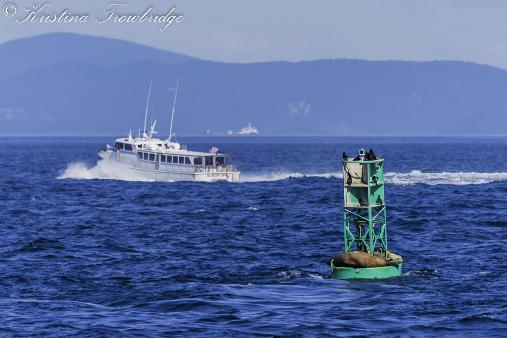 A buoy, Steller sealions, cormorants and a boat