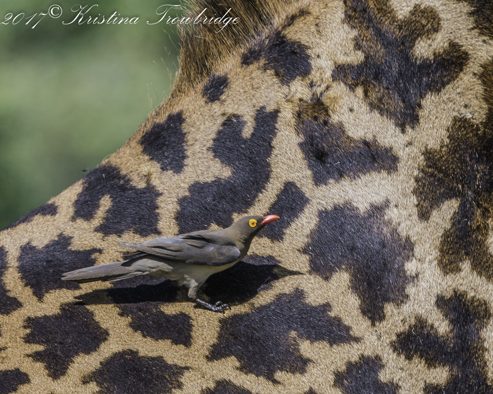 Red-billed oxpecker on Giraffe chewing cud