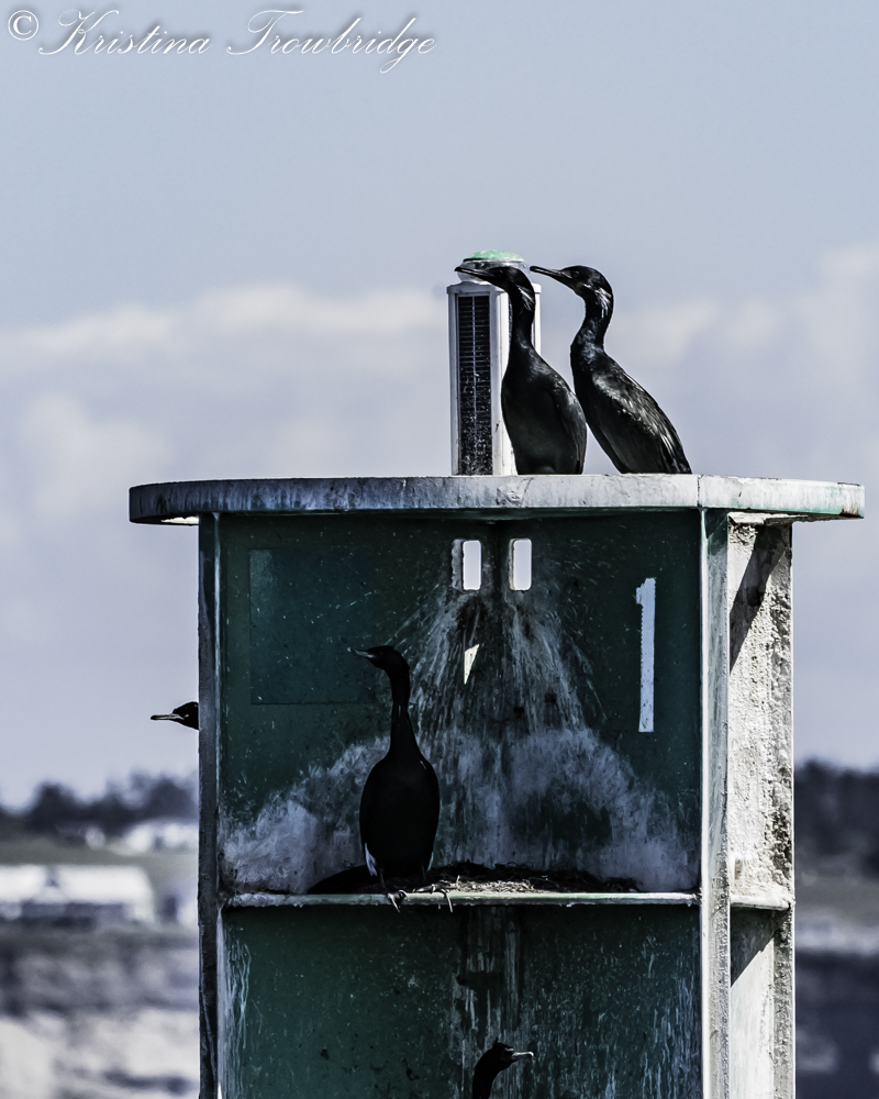 Kissing cormorants on a marker