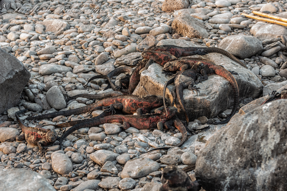 Marine iguanas in sunset glow