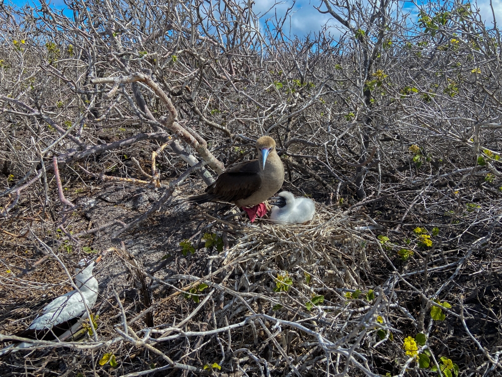 Red-footed Booby with chick and a Nazca Booby