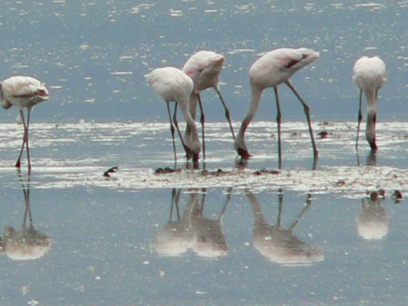Flamingoes live in shallow lakes and salt pans