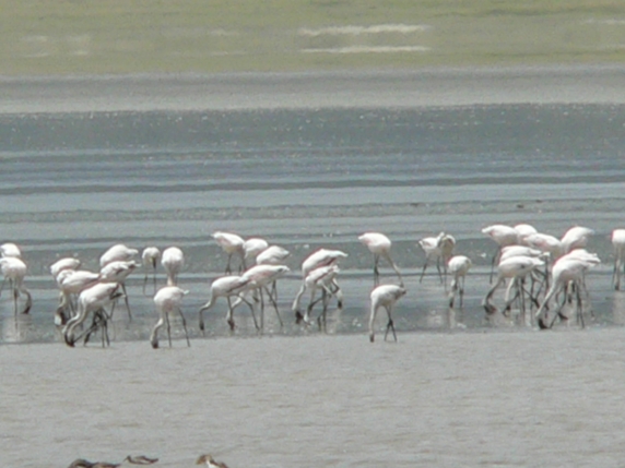 There are lots of flamingoes living in the soda lake on the crater floor