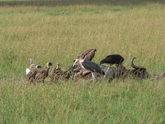 vultures and storks at a buffalo kill