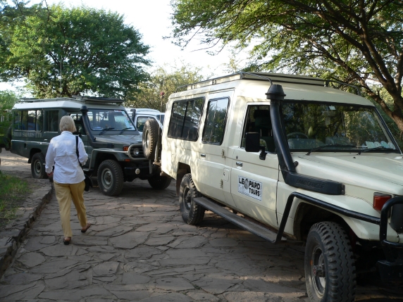 safari vehicles line up at 6:30 am