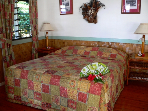 Each bungalow is furnished with lounge suite, coffee table, writing desk, dressing table, open wardrobe and queen size bed