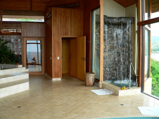 Built to complement its surroundings, the 10,000 square foot spa was constructed from native palm wood, rock, and palm thatch