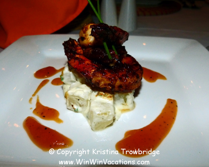 Pan seared harissa prawns with papaya coulis and creme fraiche