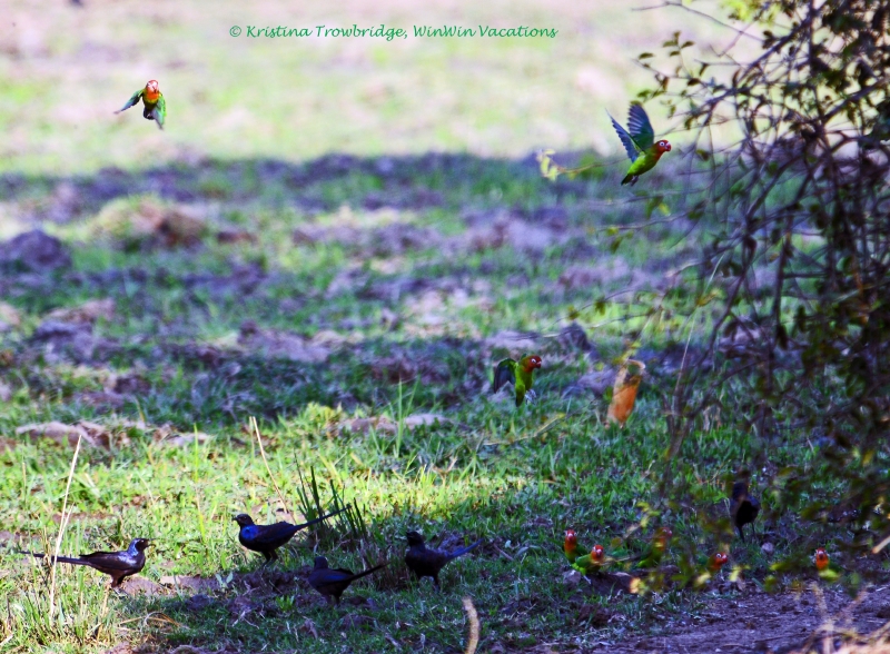 Lillian's Lovebirds and Meves's Longtailed Starling