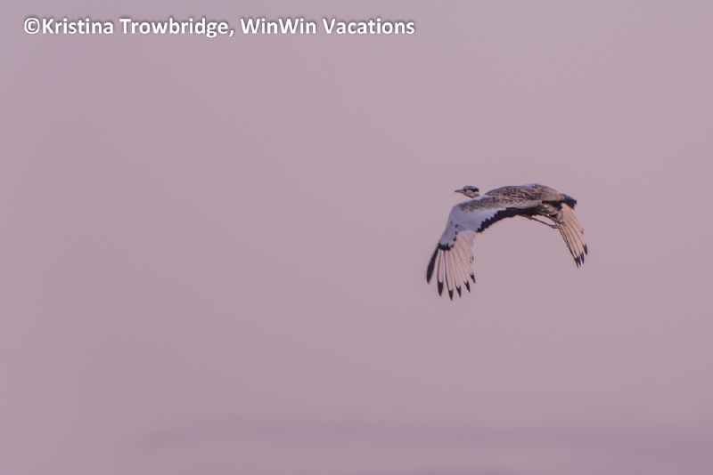 Black-bellied bustard taking off into the sunset