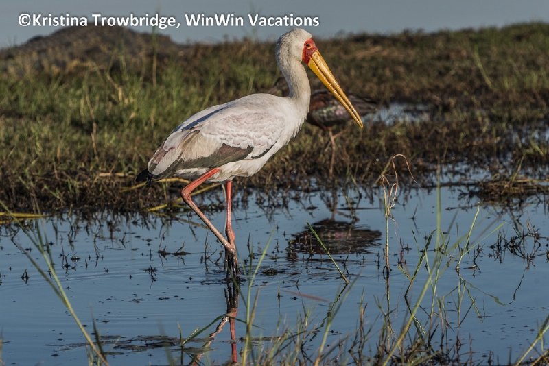 Yellow-billed stork, Glossy Ibis behind