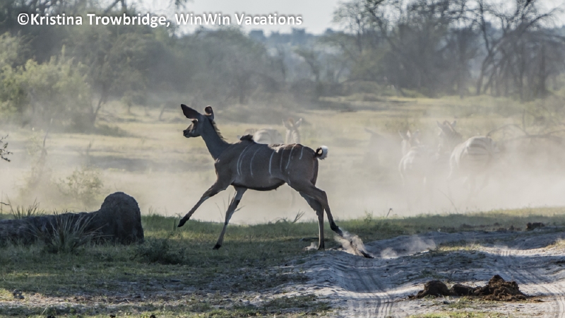Zebras and kudu in dust