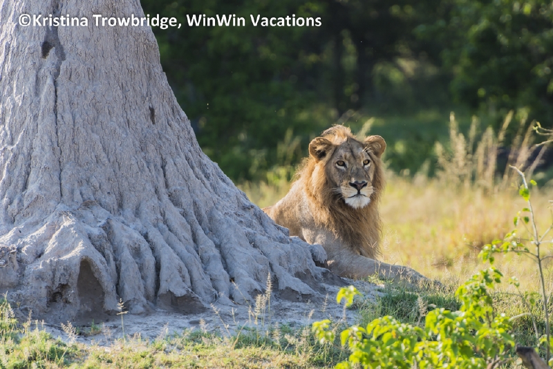 Young lion behind termite mound