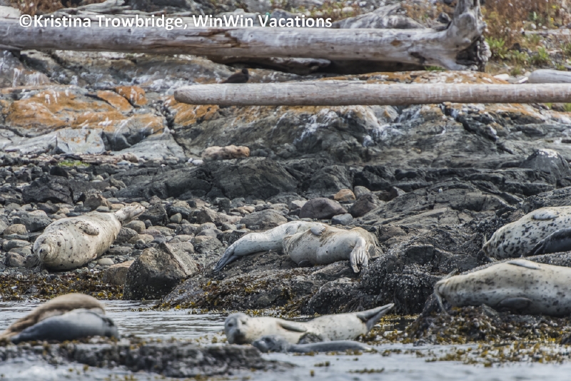 Harbor seals on driftwood