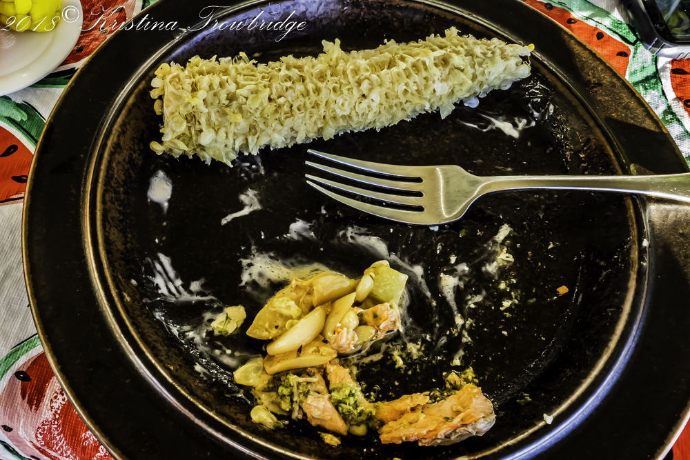 Dinner of corn, salmon with pesto & pine nuts