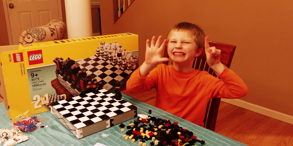 James with lego chess board