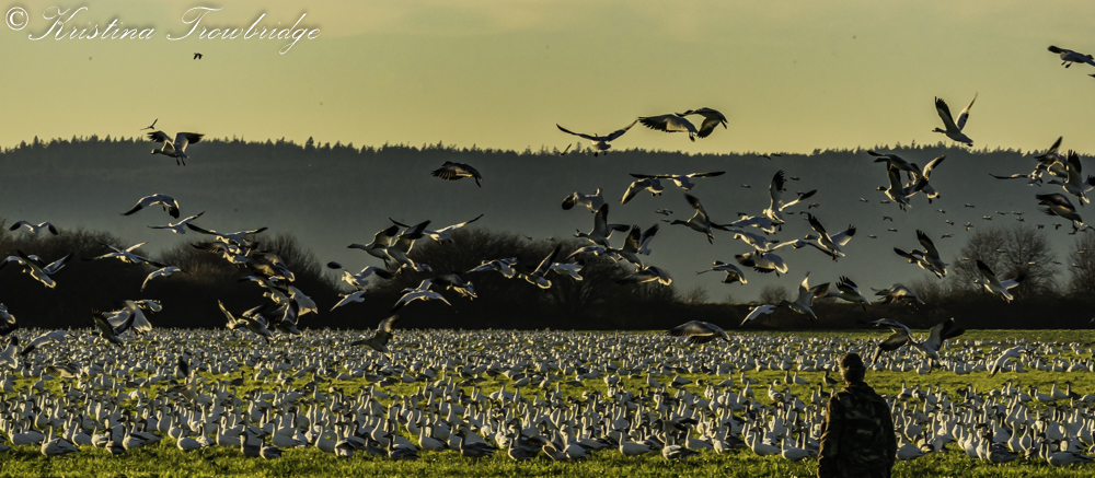 Snow Geese fly into the sunset, hunter & dog