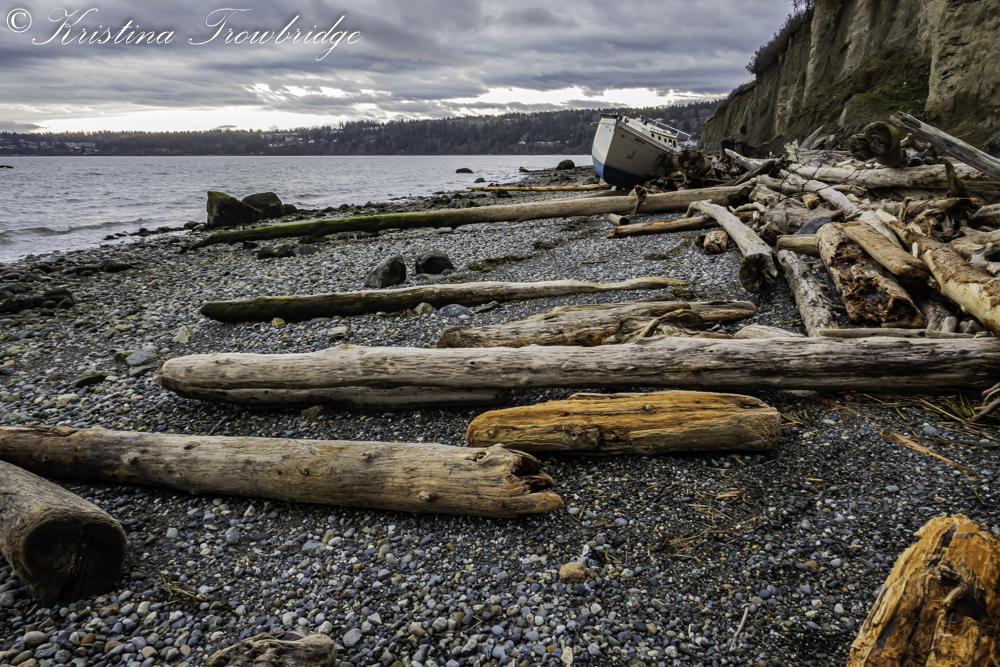 Washed up logs and beached sailboat