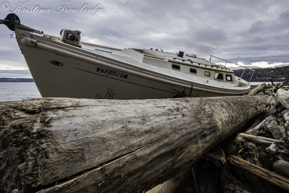Washed up logs and beached sailboat