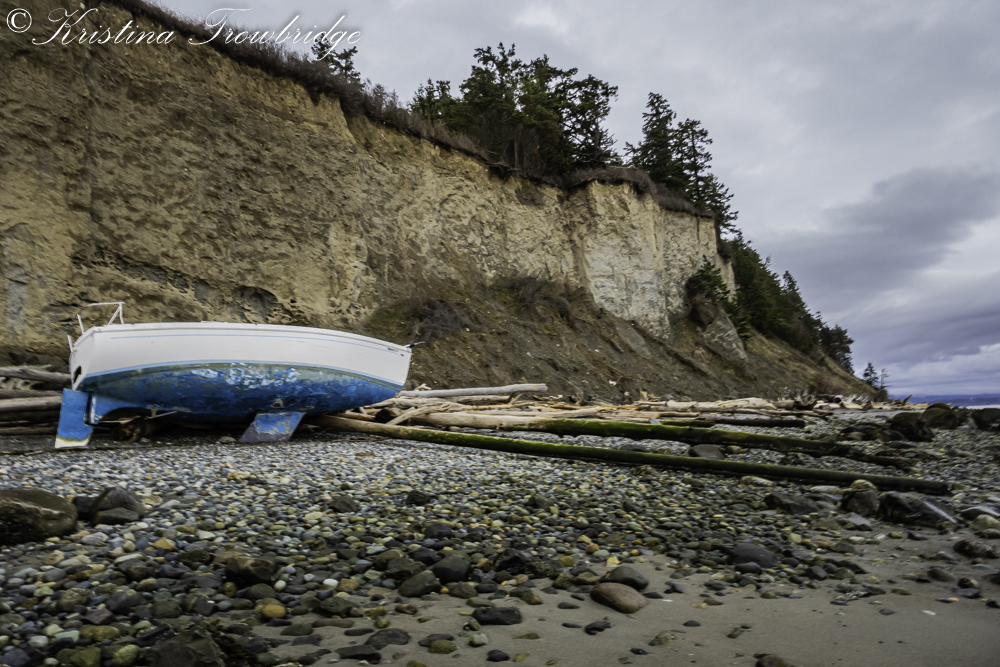 Washed up logs and beached sailboat