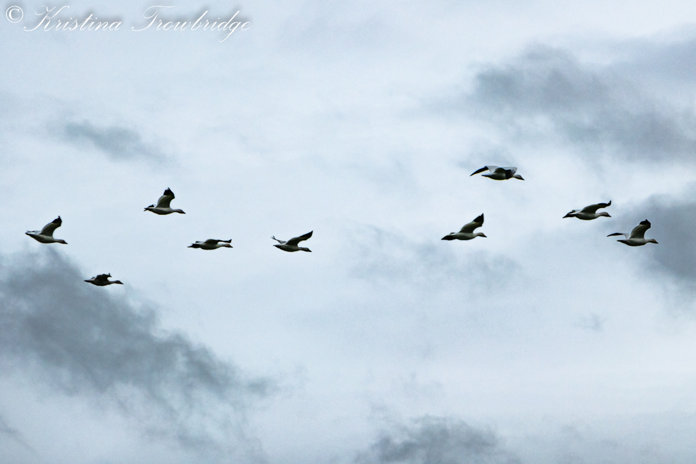 Snow geese fly over head