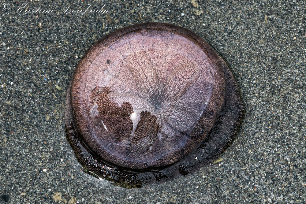 A baby Moon Jelly on top of a Sand Dollar