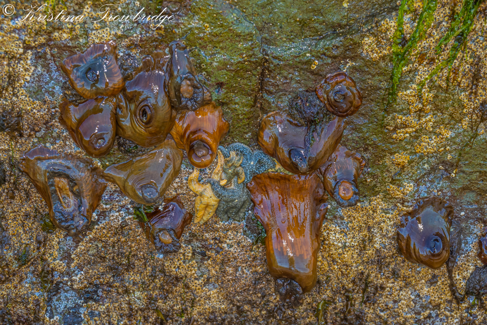 Under a rock are sea stars, kelp and anemones